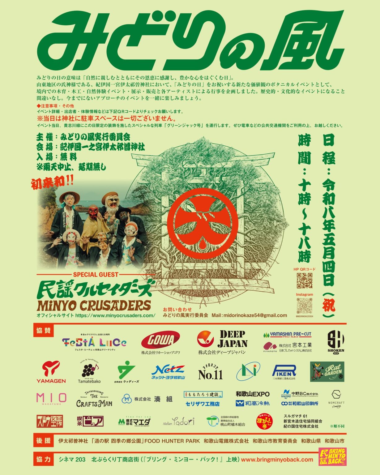 木の神様として有名な紀伊の国一之宮・伊太祁曽神社を会場に、みどりの日をお祝いするイベント「みどりの風」(主催:みどりの風実行委員会)が開催されます!