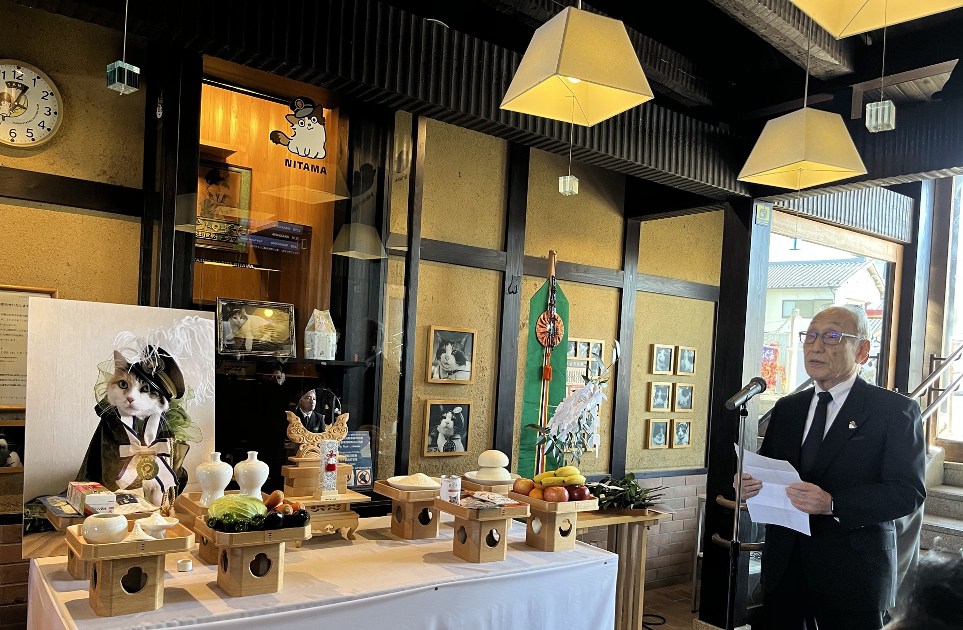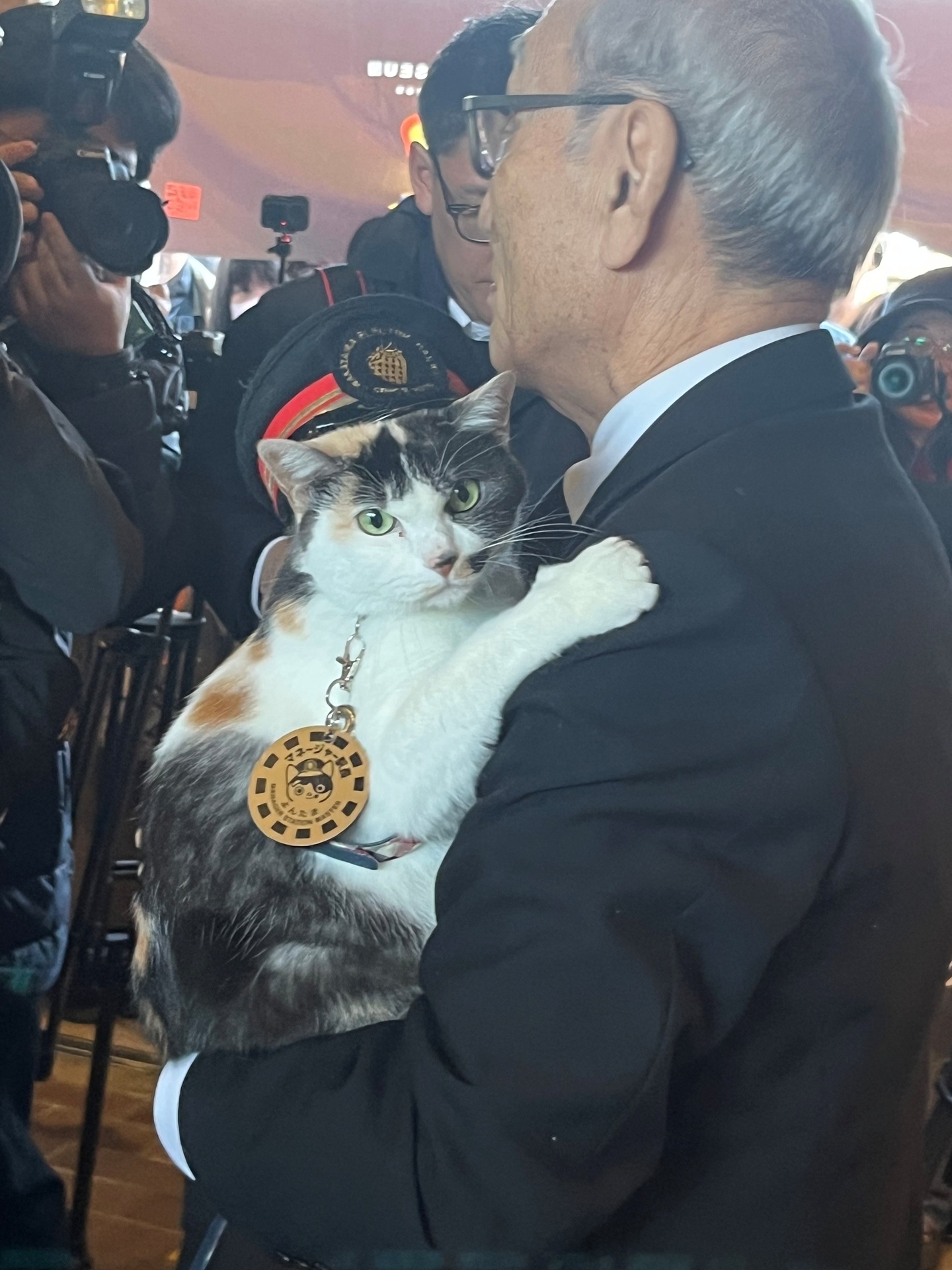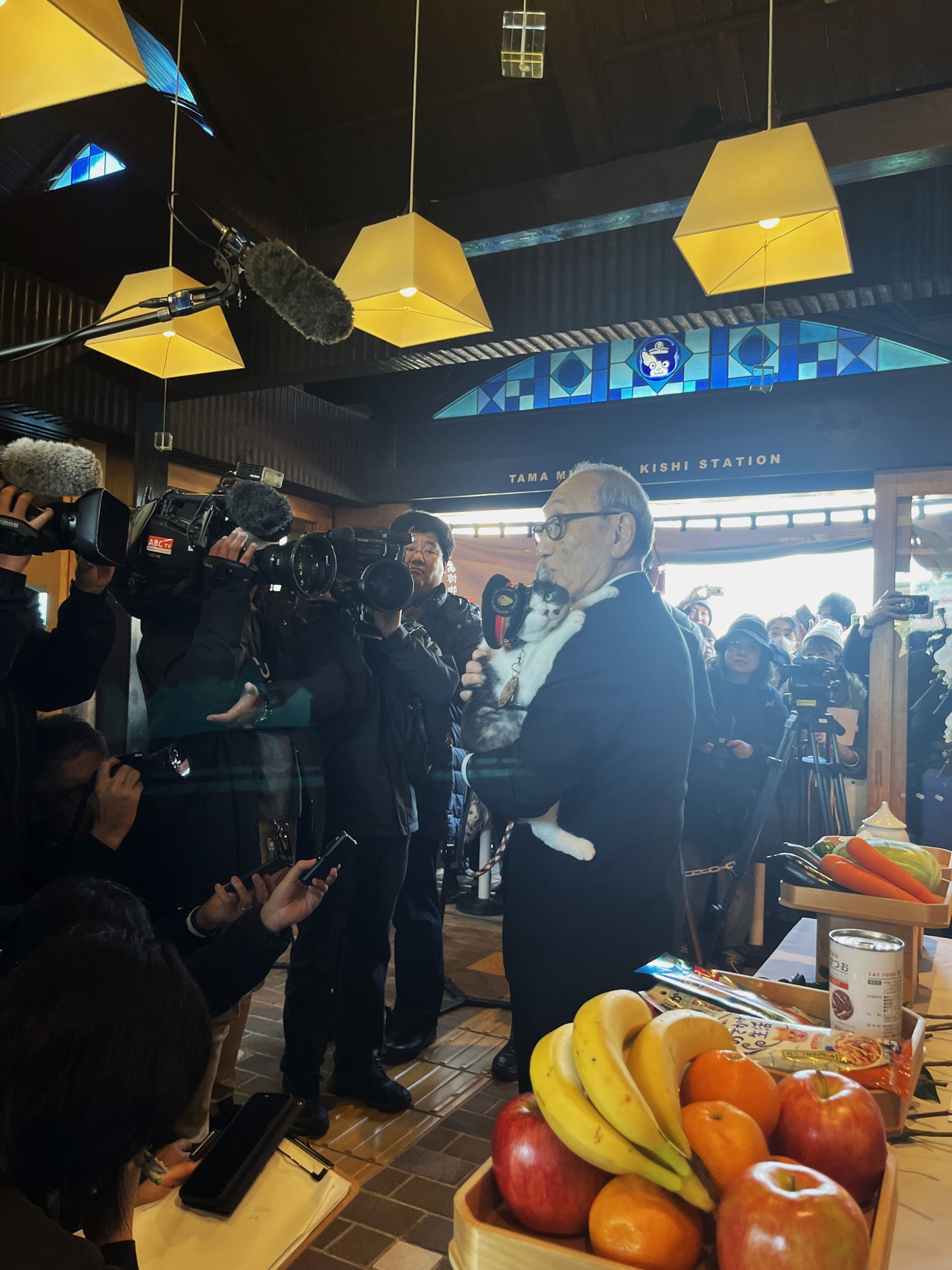 そして、これまで二タマ駅長へ温かい声援をしてくださった乗客の皆さん、今日もお手伝いしてくれた「貴志川線の未来をつくる会」の皆さん、和歌山県、和歌山市、紀の川市の知事、両市長はじめ行政の皆さんに感謝し、里親として温かく支えてくださった麻生専務取締役とご家族の皆さま、社員、同僚の猫駅長の皆様に心から敬意を表します。